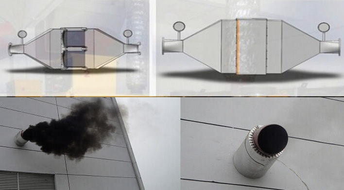 本裝置利用壁流式陶瓷濾芯的特征,將黑煙顆粒捕集在陶瓷濾芯的內(nèi)部通道內(nèi),以達(dá)到排放尾氣去除黑煙的目的。能除去尾氣中的黑煙顆粒物(PM),去除效率80-90%;